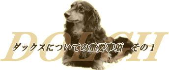 この3タイプは、だいたいこのような傾向の犬が多いという意味ですが、犬を見るとどこの犬かほとんど分かります。ただ、すべてにあてはまるわけではありません。例外もいるということを頭に入れておいて下さい。どのタイプが好みであるかということを念頭において、お買い求め下さい。この説明は簡素化して一般の方向けに分かりやすい言葉で表示して箇条書きにしてあります。(一般に分かるように専門用語は出来るだけ使ってないつもりです。それでも、意味が分からなければ、一般の方のみメールにてご質問ください。このドルグのホームページすべてのページに関して、専門でしか知らなくても良い事については、記述は一切しておりません。)ただ、このタイプの判別に関しては、今、日本で良く見かける国別のダックスの見分け方を大まかに分かりやすく書き記した文章です。ダックスの中には、2つのタイプの血が交じっていたり、それが3つのタイプの混合の犬もいますので、その場合上記文章がすべて当てはまるわけではありませんのでご了承ください。あくまで代表的特徴を一般の方に分かりやすい観点を例にあげ、違いが分かる部分でのみ記載しております。また、イギリスで生まれアメリカで育ったという犬も多数おりますので、その点は考慮しながら、読み分けて下さい。参考程度にお読みください。ここが悪いからダメとか、どの国のタイプが良いという判断につきましては、本人の好みの問題です。この文章すべてに関して、この国の犬はダメだと中傷するものではありません。ただ単にタイプが違うだけです。可愛らしさは同じですから。ただ、この国の犬の血液でブリーディングをしようと考えを持っている繁殖者の方や各国良い部分を出し切れるようなブレンドをし自分なりの繁殖方法を考えている方にとって必要でない血液や他の国のタイプ・犬質等は一切、興味がないということはいえるでしょう。ご自分の好みの犬のタイプによって購入時に参考にして、その国のタイプの繁殖を行っている繁殖者の方を探されて下さいね。